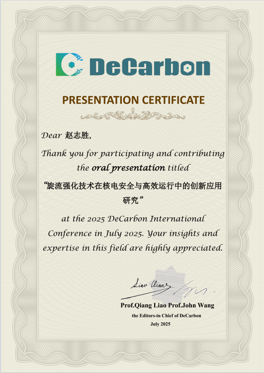 分论坛上,赵志胜系统汇报了公司碳捕集转化及细颗粒物分离纯化团队研发的旋流强化技术及其在核电领域的工程应用,详细阐述了旋流器设计与分离机理的突破性成果,并与现场专家深入讨论了技术工业化适配性、高精度分离稳定性及火电、化工领域跨行业应用潜力等关键问题,就设备耐腐蚀性提升、流场模拟优化等方向形成共识。值得注意的是,会议召开同期(7月22日),中国聚变能源公司作为国家队新平台正式成立,标志着我国可控核聚变进程迈入新阶段,同时彰显出核电领域安全及高效运行等研究的发展前景。