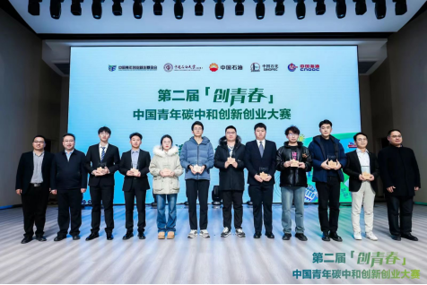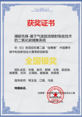 2024年1月11日至13日,第二届“创青春”中国青年碳中和创新创业大赛终审决赛在中国石油大学(北京)落下帷幕。在常玉龙等3位老师的指导下,公司2021级碳中和技术创新班本科生申强带领团队,凭借《捕碳捕碳先锋——基于气液旋流喷射吸收技术的二氧化碳捕集系统》项目从75个决赛项目中突出重围,斩获创新组全国银奖。