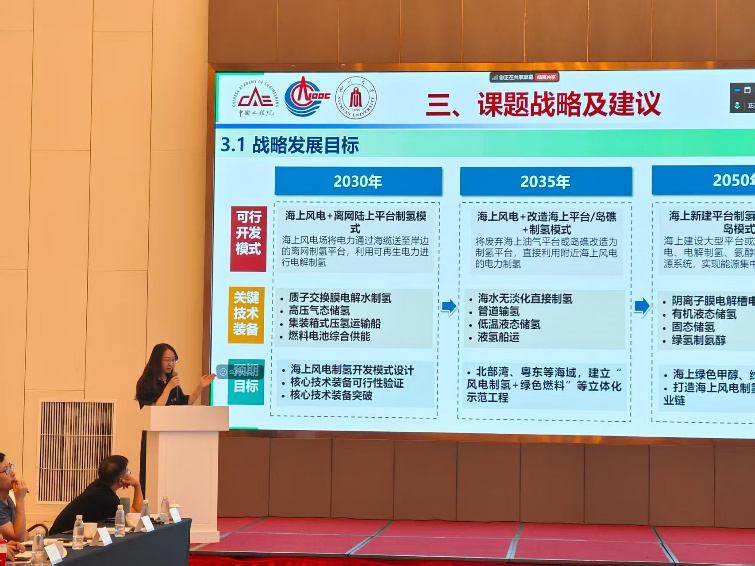 公司吴霁薇副研究员负责“我国海上浮式风电产业发展战略研究”项目任务五个课题之一“海上浮式风电规模化开发电氢耦合技术及装备研究”。会上,吴霁薇从项目基本情况、主要研究成果和课题战略及建议三个方面介绍了该课题项目研究进展与结题成果。