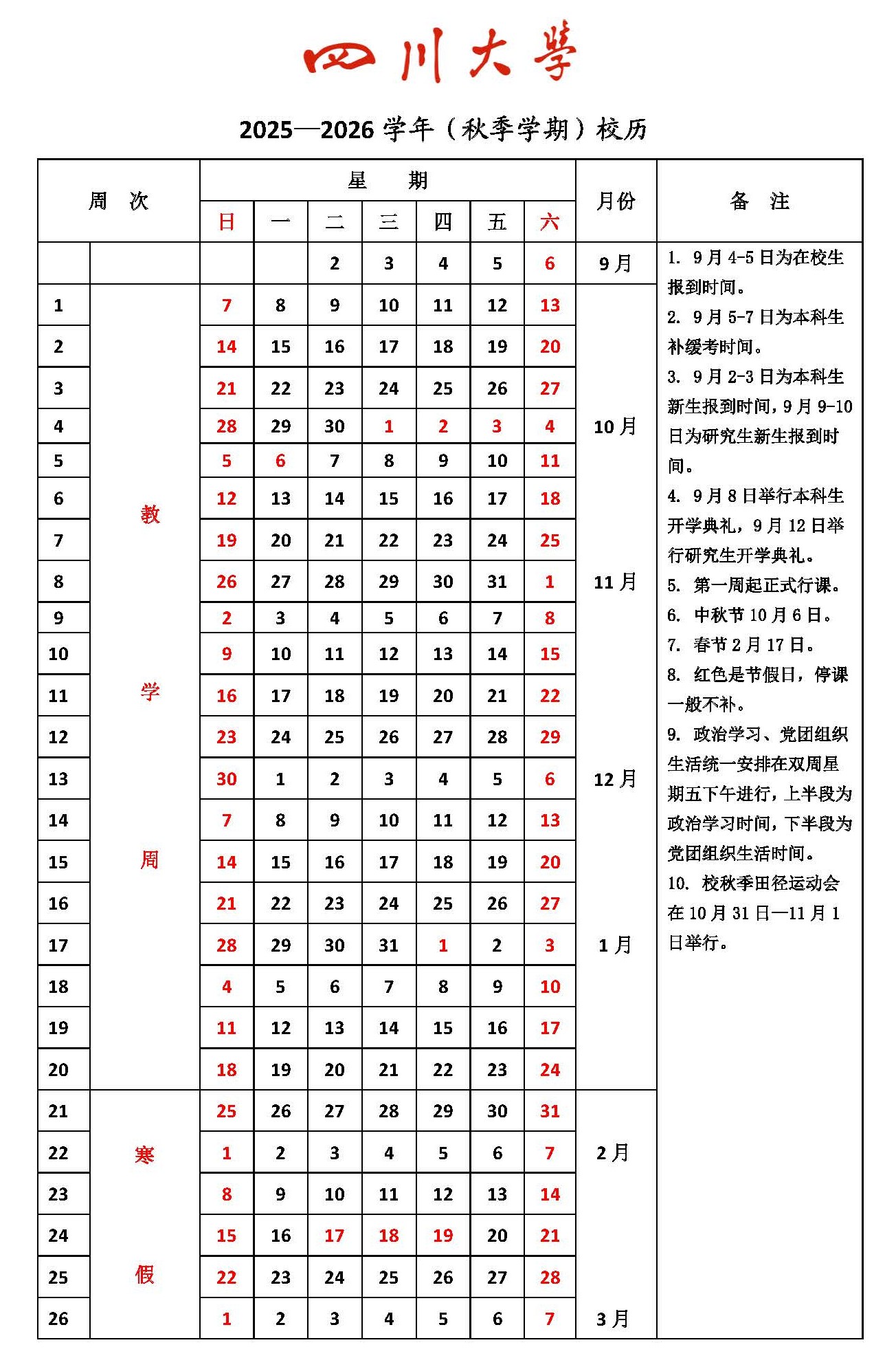 太阳集团tcy8722校历 2025—2026学年(秋季学期)